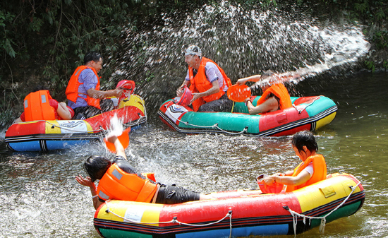 景区内京北第一漂,起伏跌宕,是北京地区唯一自然河漂流项目。漂流活动约10公里。乘皮筏顺流而下,但见两岸忽而悬崖陡壁,如刀削斧劈;忽而奇峰怪石,迎面耸立;举目四望,亦可见雄鹰盘旋,苍松古柏傲立岩崖。皮筏时而卷入旋涡,时而平静安逸,既能体验船摇欲翻之惊,又无溺水伤身之险。许多游客油然赞叹:可与三峡之游相媲美。漂流活动可一人独乐,也可三、五人结伴,可竞技,亦可娱乐,不失为一项老幼皆宜,独具风趣的游乐项目。许多游客漂完仍感意犹未尽。